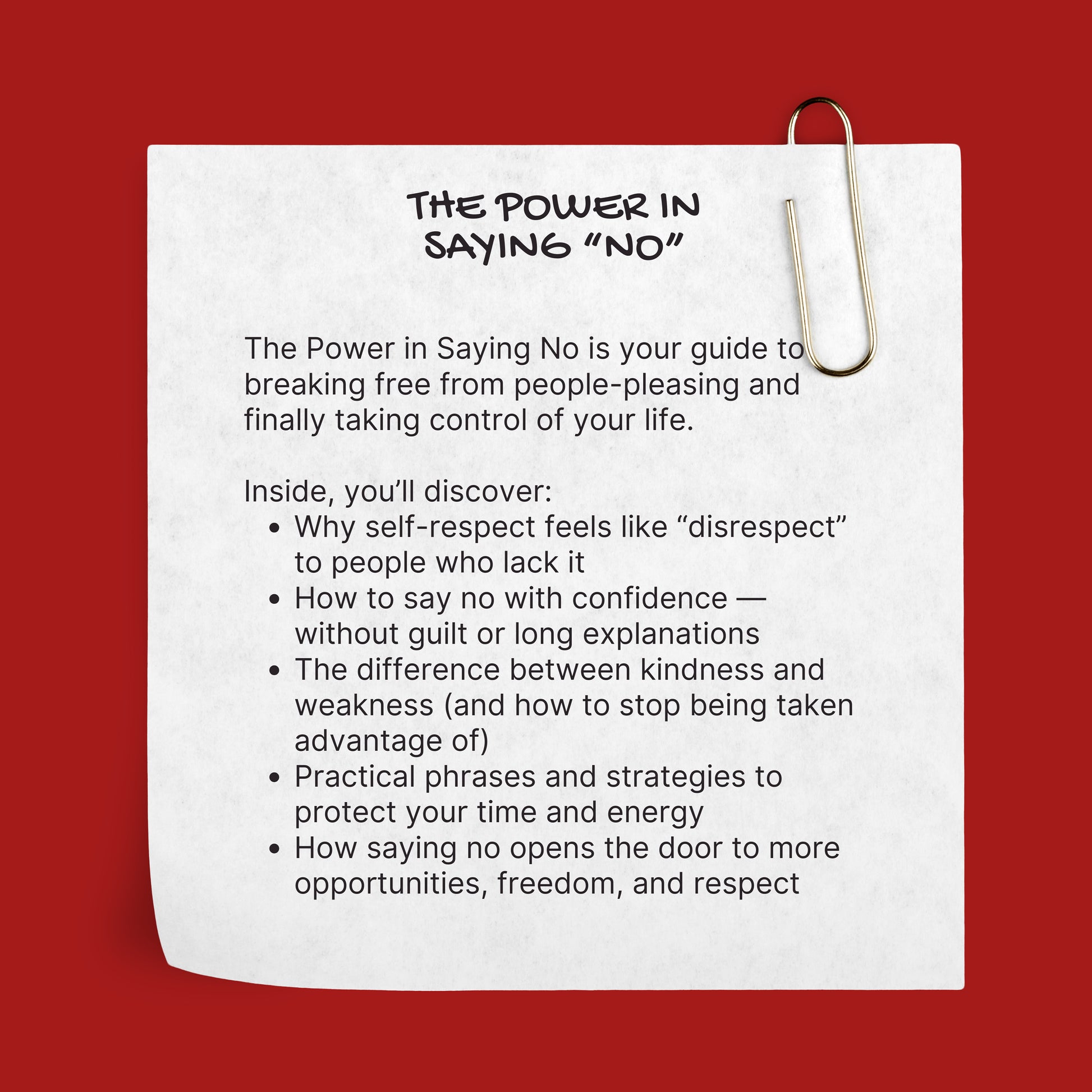 Discover The Power in Saying NO — a powerful self-help journal that helps you set boundaries, stop people-pleasing, and protect your peace without guilt. Whether you struggle to say no to friends, family, or coworkers, this journal gives you 100 powerful responses, explanations, and real-life examples to help you say no confidently and clearly.